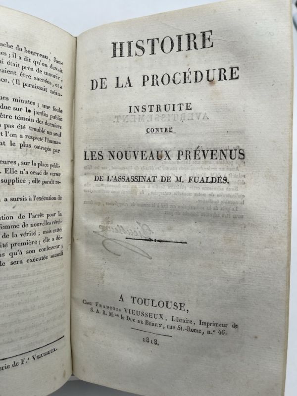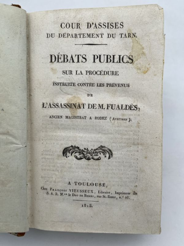 A Toulouse chez François Vieusseux 1818, In-8 relié demi basane blonde, dos lisse à fleurons dorés, pièce de titre. 372 + 4 pages pour “Derniers moments de Bastide, Jausion et Colard, assassins du sieur Fualdés, éxécutés à Albi le 3 juin 1818”. Avec un plan dépliant du quartier ou a eu lieu l’assassinat. Relié en suivant “Histoire de la procédure instruite contre les nouveaux prévenus de l’assassinat de M. Fualdès”. Toulouse, F. Vieusseux, 1818. 205 pages + 20 pages contenant le texte des actes les plus importants du procès. Reliure frottée, coins émoussés, la page de titre est un peu tachée sans grande gravité, pour le reste corps de l’ouvrage en bon état. L’ouvrage est bien revètu de la signature de l’éditeur à plusieurs endroits. Bon exemplaire