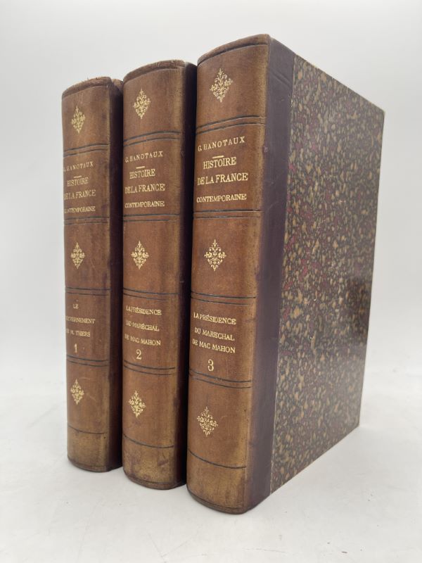 Furne Combet, sans date, vers 1900, 3 volumes grands In-8 reliés demi-basane brune, dos lisses à filets et feurons dorés. XI + 639 + VIII + 707 + 731 pages avec portraits gravés sous serpentes. I : Le gouvernement de M. Thiers. II : La présidence du Maréchal de Mac Mahon – L’échec de la Monarchie. III : La présidence du Maréchal de Mac Mahon – La Constitution de 1875. Quelques rousseurs néanmoins très bon exemplaire.