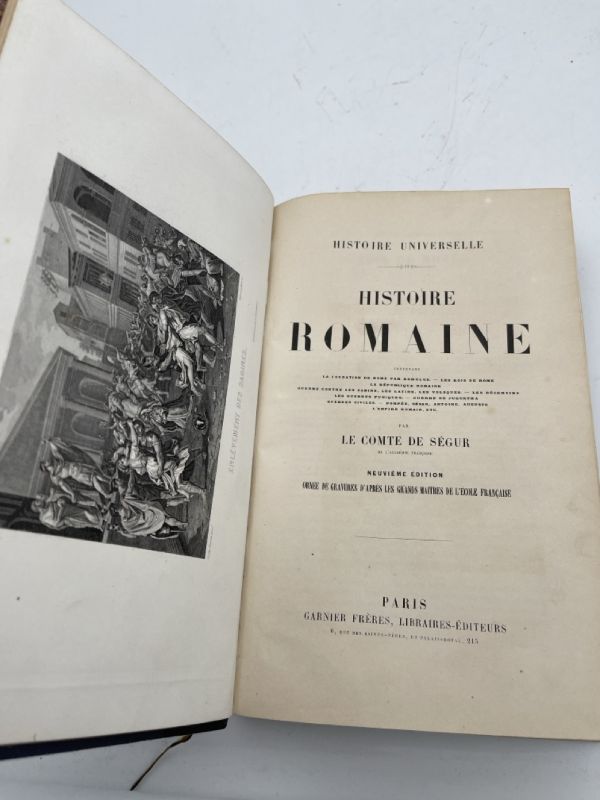 Paris, Garnier frères, vers 1850. Petit In-4 relié demi-chagrin chocolat, dos à nerfs soulignés de pointillés dorés, fleurons et titre dorés. Reliure signée Vidal. Frontispice sous serpente, titre, 738 pages. Neuvième édition ornée de gravures d’après les grands maîtres de l’école française. Contenant : Contenant la fondation de Rome par Romulus – Les rois de Rome – La république Romaine – Guerre contre les Sabins, les Latins, les Volsques – les Décemvirs – Les guerres puniques – Guerre de Jugurtha – Guerres civiles – Pompée, César – Antoine, Auguste – L’Empire Romain, etc. Rousseurs essentiellement de la page 78 à 112. sinon bel exemplaire bien relié