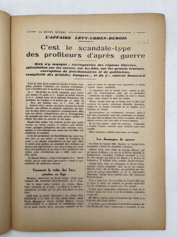 Paris, La Bonne Guerre, 1935, N° du 12 janvier. In-4 agrafé de 26 pages. Revue politique et économique satirique dirigée par jean Sartori. Sommaire : L’énigmatique colonel Comte de la Rocque. Les grandes banques d’affaires. Le scandale Levy-Cohen-Dubois. A travers les groupes et les ronds. Aux galeries Lafayette. Protecteur et obligé de Bader. La franc-maçonnerie sur la place publique. Autour du film Golgotha. La Pologne ennemies de la France. La Bonne Guerre financière. Bon état.