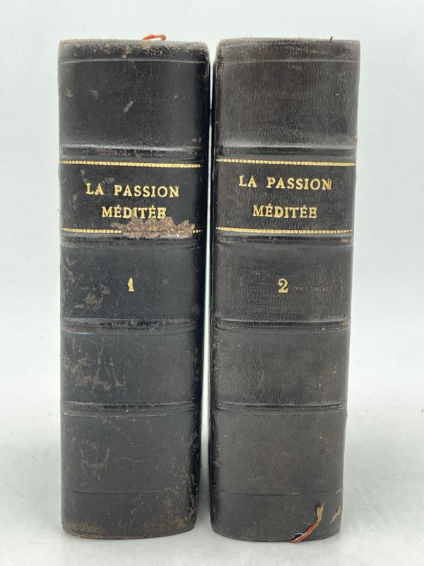 Desclée, Bruxelles, Montréal, 1904. 3 tomes reliés en deux volumes in-12. Demi basane noire, dos à nerfs titres dorés. Frtontispice, XXVIII + 378 + 504 + 558 page. Texte encadré en rouge. En fin du tome est est ajouté en manuscrit : Méthode pour entendre la messe d’arpès St Liguory, quand on doit communier : environ 50 feuillets. En fin du tome deux est ajouté en manuscrit : AMDG : Messe d’après la bienheureuse Marguerite Marie ; suivie de ; Action de graces après la Sainte communion ; préparation à la Sainte communion, Action de grâces pour la Sainte communion, préparation à la Sainte communion, Action de grâces après la Sainte communion, messe en l’honneur de Saint Joseph, messe à laquelle on doit communier (environ 400 pages ; agréablement calligraphiées et décorées). Titre du tome 1 légèrement frotté en dos, sinon très bon état. Tome 1 : Agonie de Jésus ; Tome 2 : Procès de Jésus ; Tome 3 : Dernières paroles, mort et sépulture de Jésus. Bel exemplaire complet.