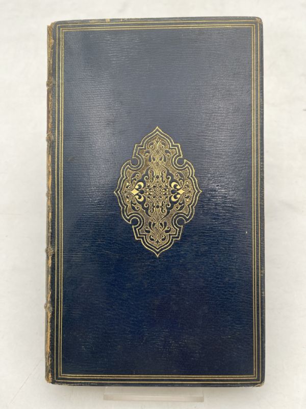 Paris, J. Miard 1867. In-12 relié plein maroquin bleu nuit, dos à nerfs et caissons soulignés de filets dorés, pièce de titre rouge, date dorée en queue mais avec une erreur de doreur 1767 au lieu de 1867, grands fleurons dorés sur chacun des plats, filets dorés sur les plats, les coupes et en bordure intérieure, toutes tranches dorées, gardes de papier marbré. Frontispice par Staal sur chine sous serpente, 113 pages. Edition originale sur papier whatman, N° 5 à la main. Coiffe légèrement arasée, dos un peu passé, légers frottements, corps de l’ouvrage en très bon état. Malgré les petits défauts signalés dont notre prix tient compte, très bon exemplaire.