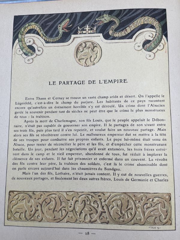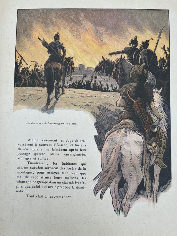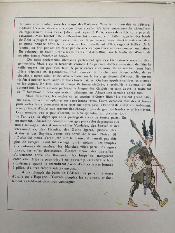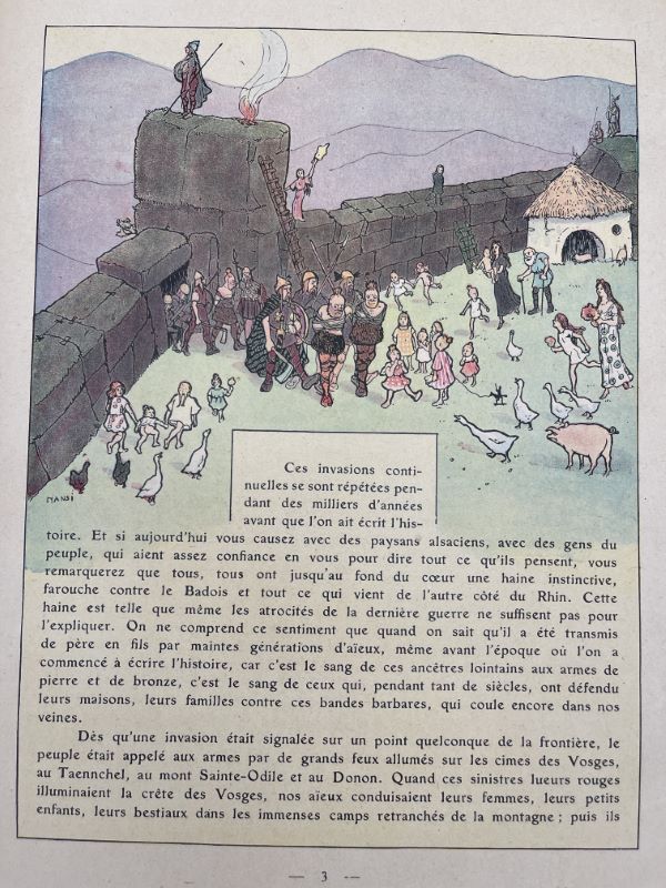 H. Floury éditeur, 1916. In-folio relié percaline bleue de l’éditeur à plats décorés (1er plat l’oncle HANSI racontant des histoires, 2eme plat la cathédrale de Strasbourg). 102 pages + planches couleurs et dessins in texte par Hansi et Huen. Une petite tache ronde sur le 1er plat, légers frottements à la reliure. Bon exemplaire malgré les petits défauts signalés.