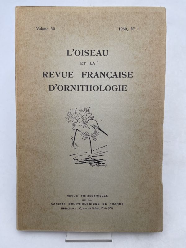 Paris, Société ornitholoque de France,1960. Année compléte, soit 4 volumes en 3 tomes in-8 brochés.300 pages. Planches photos en hors texte.Entre autres articles : les preméres tentatives d’acclimatation du cygne noir en France – Quelques notes sur le faucon sacré – Note sur les oiseaux de la Haute Maurienne – Contribution à l’étude de l’avifaune de l’étang d’Epoisses – Distribution des oiseaux de l’est de Bornéo – La forme du bec, caractére sexuel secondaire chez la cygogne blanche adulte – Cadence et capacité de ponte chez quelques oiseaux – Les anatides du Cameroun – Sur la biologie de l’alouette calandrelle – Oiseaux observés à l’ile de Houat – Le transport des jeunes oiseaux hors du nid par leurs parents … etc… Bon état