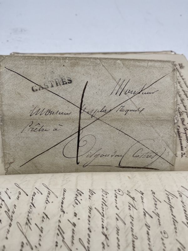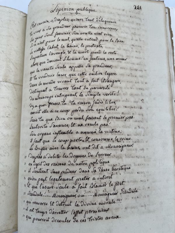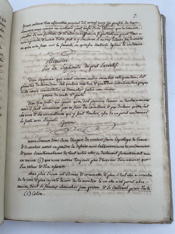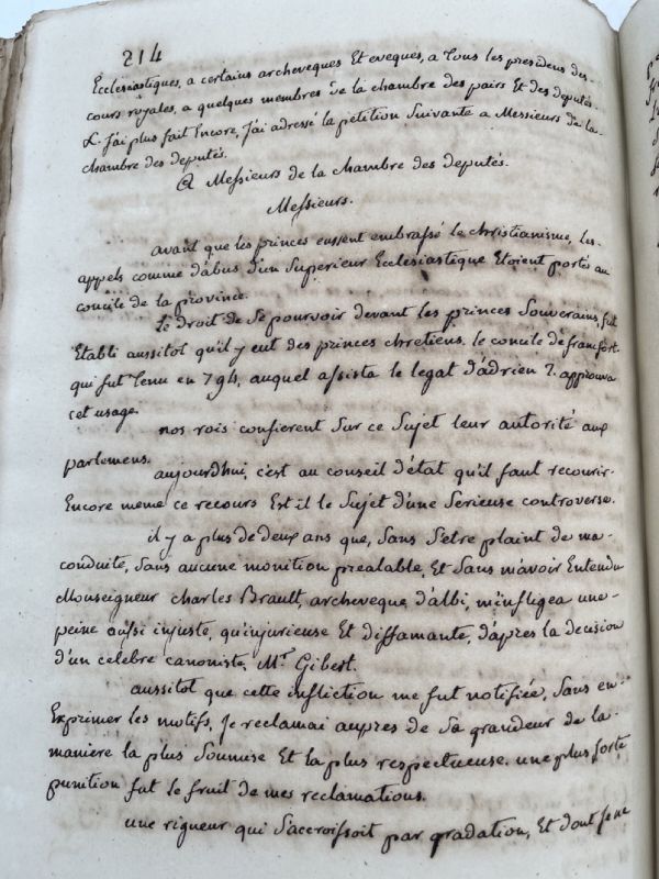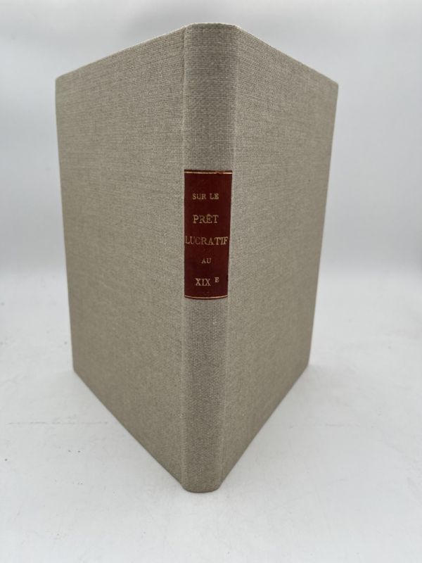 Sans lieu, sans date. Vers 1829. In-4 relié pleine toile grise, pièce de titre rouge en dos. Réunis en un seul volume un ensemble d’écrits de 1824 à 1829 et de lettres concernant l’ouvrage de Jean Pierre Desplats-Roques, prêtre, ancien prébendien de Castres (Tarn), paru sous le titre de “Mémoire sur la légitimité du prêt lucratif” édité par Auger à castres en 1824. Concerne également “Réponse aux observations qui servent d’introduction à la brochure ayant pour titre : Réfutation du mémoire sur le prêt lucratif, paru chez Vidal à Castres en 1824 ainsi que la brochure du même titre paru en suivant chez Auger, en 1825 et l’appel de M. Desplats-Roques à l’Opinon publique, parue chez Vidal en 1826 ainsi que le second appel paru la même année”. L’ensemble couvre 282 pages, entièrement manuscrites et très lisibles. Un document de trois pages intitulé “L’opinion publique” adressé a Desplats-Roques, prêtre à Vilgoudou (Castres) est relié avec l’ensemble. Il s’agit d’un courrier, avec son enveloppe, en forme de complainte que l’on retrouve retranscrit dans le corps de l’ouvrage sur deux pages et demies. La présence de ce document relié avec l’ouvrage laisse penser qu’il s’agit d’une copie des écrits et diverses correspondances qu’à pu avoir Desplats-Roques. Le papier est bien d’époque, la rédaction d’une écriture uniforme, et bien lisible, à la plume. En fin d’ouvrage on peut lire un plaidoyer en faveur de l’abbé Desplats-Roques de la même écriture que tout l’ouvrage, manifestement d’un défenseur et fin connaisseur de l’affaire. En son temps, les écrits du curé de Castres lui valurent d’être limité dans l’exercice de son culte puis suspendu de toutes fonctions et générérent bien des polémiques et prises de positions diverses, notamment celles de l’Abbé de Lammenais dont on retrouve deux copie de lettres dans l’ouvrage.Très bon exemplaire.