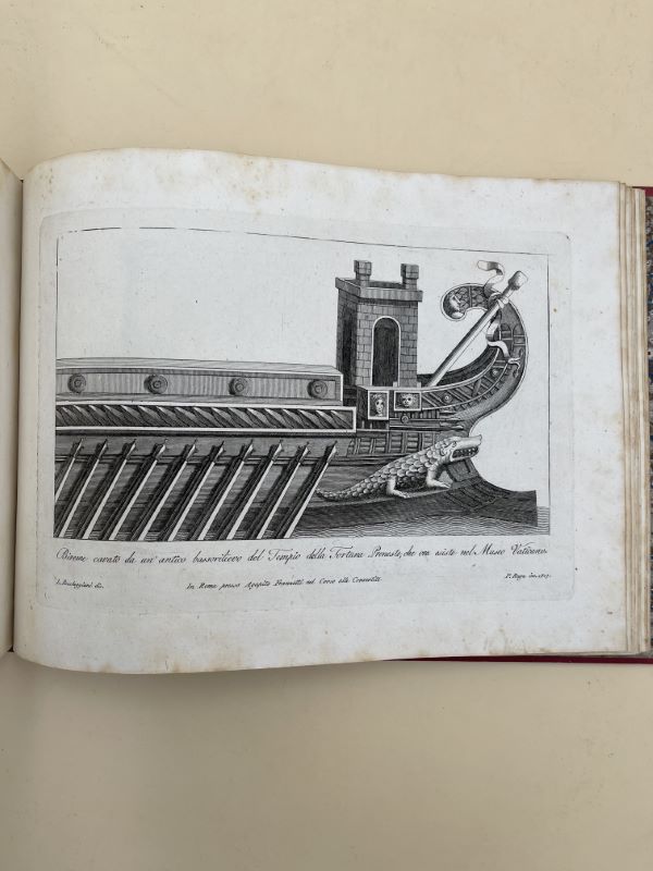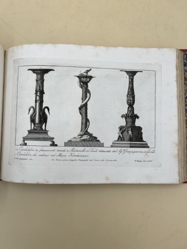 Roma, Presso Agapito Franzetti, 1805 – 1809. In-8 relié à l’Italienne (oblong) demi-basane rouge. 98 planches gravées par P. RUGA. Format hors marge : 15,5 x 22,5cm. Avec marge : 19,5 x 27cm. Page de titre dans un encadrement. Chaque planche comporte plusieurs sujets légendés en marge inférieure. Quelques rousseurs mais néanmoins bon exemplaire.