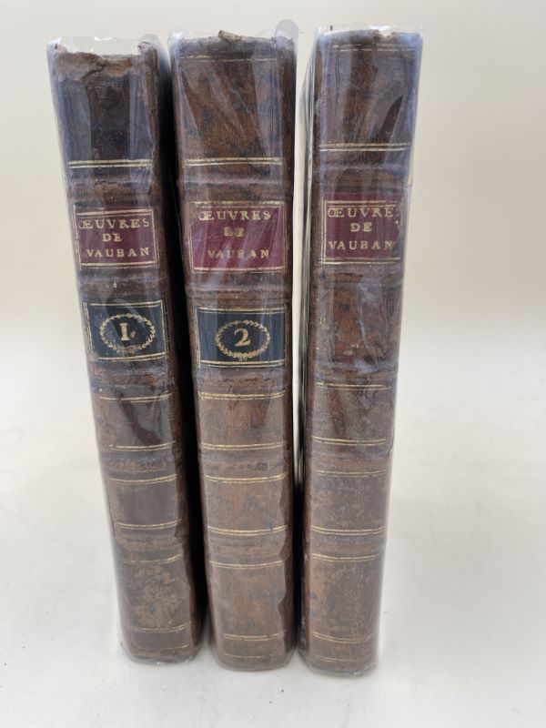 A Paris, rue Dauphine chez L. Cellot et Jombert fils jeune, Charles Antoine Jombert, 1779. 3 volumes In-8 plein veau de l’époque, pièces de titre et de tomaison, rouges et vertes, gardes de papier marbré. Petit manque de cuir à la coiffe du tome I, coins émoussés, épidermures sur les plats des tomes I et III, manque la pièce de tomaison du tome III. Malgré les défauts signalés, très bon exemplaire, intérieur très frais, bien complet. Tome I : Traité de l’attaque des places : Faux-titre, titre, xl pages, épitre de Vauban à Mgr le Duc de Bourgogne, préface, éloge de Mr le Maréchal de Vauban prononcé à l’Académie des Sciences en 1707 par Mr de Fontenelle, table des chapitres, 262 pages, bien complet des 29 planches gravées. La planche 14 présente un petit manque de papier marginal n’atteignant pas la gravure, pas même l’encadrement. Tome II : Traité de la défense des places, ouvrage original de M. de Vauban : Faux-titre, page de titre à la date de 1779, second faux-titre, seconde page de titre. A Paris chez Charles Antoine Jombert père 1769. xvi pages, avertissement et table des articles, 3 pages pour l’approbation du 12 avril 1769 à Versailles et le Privilège du Roi du 10 mai 1769. 334 pages pour les trois parties de ce Traité incluant la table alphabétique raisonnée des matières et l’avant propos, une page pour les additions, corrections et l’avis au relieur. Bien complet des 15 tables dépliantes et des 9 planches dépliantes gravées. La troisième partie contient Le Discours sur la Défense des Places par Deshouilleres, publié avec des notes critiques de Vauban. EO pour ce Traité. Tome III : Traité théorique et pratique des mines : Joint un Traité de la guerre en général, comprenant les qualités et les devoirs des gens de guerre, depuis le Général jusqu’au soldat et des règles sur les principales opérations militaires par un Officier de distinction. Faux-titre, page de titre, xx pages, préface de l’éditeur et table, 60 + 243 pages. Le Traité des Mines est divisé en deux parties. Complet des 18 planches dépliantes. Ex-libris manuscrit Geouffre, Adjudant Général sur les 3 pages de titre. Notes manuscrites du temps en marges de certains chapitres, parfois importantes et anecdotiques, réflexions du plus grand intérêt, n’altérant en rien l’ouvrage. En résumé bel ensemble, parfaitement complet.