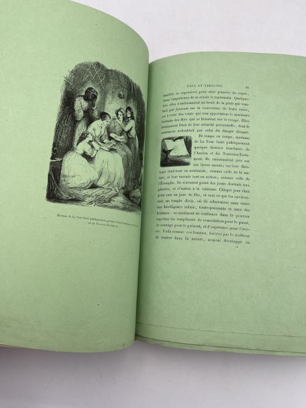 Paris, Furne Libraire Editeur, 1853. In-4 relié plein maroquin marron, dos très orné à cinq nerfs soulignés de pointillés dorés, lieu et date dorés en queue, plats richement décorés de larges fleurons d’angle et en bordures, large bande d’encadrement de filets dorés, filets dorés sur les coupes, large dentelle intérieure en encadrement des contreplats, gardes de tissu à petites fleurs, toutes tranches dorées, couverture et dos conservés. Superbe reliure en parfait état signée Pagnant au bas du 1er contre plat. Rarissime exemplaire imprimé sur papier vert, non rogné. XL + 330 pages. Avec emboitage. Bien complet de la carte de l’Ile de France (Ile Maurice) dressée par H. Dufour, datée 1836 et gravée par Dyonnet, en couleurs. 7 portraits hors-texte gravés sur acier, sur papier blanc : Bernardin de Saint Pierre par Lafitte. Marguerite par Johannot. Madame de la Tour par Johannot. Virginie par Johannot. Le Docteur par Meissonier. La jeune Bramine par Johannot. Vignettes sur bois dans le texte et hors-texte. Les pages 303 à 330 contiennent la FLORE qui complète l’ouvrage. Superbe exemplaire dans une magnifique reliure de Pagnant.