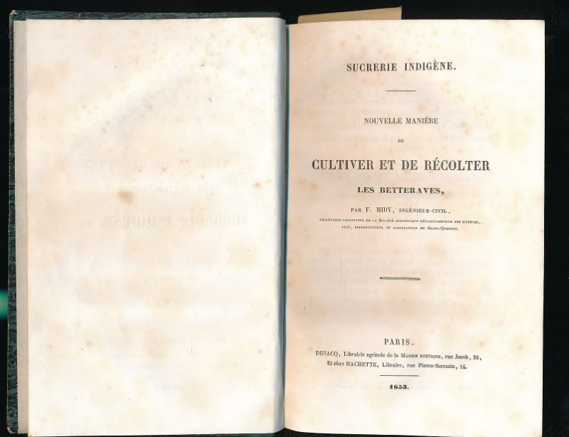 Paris, Dusacq, 1853. In-8 relié demi-basane verte, dos lisse, titre doré de 45 pages. Relié avec : BAUDRIMONT M.A. : “Notice sur la préparation de différentes boisssons propres à remplacer le vin, rédigée sur la demande de la Société d’Agriculture de la Gironde”. Bordeaux, Lafargue, 1855. 21 pages. Relié en suivant : GRANGES DE RANCY E. de : “Petit traité de comptabilité agricole en partie simple”. Paris, Librairie Agricole, sans date, 80 pages. Relié en suivant : EVON M.N. : “de l’engraissement du gros bétail et de quelques autres espèces domestiques”. Paris, Librairie Agricole, 1860. Complet des deux planches et d’un tableau. Relié en suivant : FRILET M. : “Notice sur la pomme de terre et l’igname de la Chine”. Paris, Librairie Agricole, sans date, 21 pages. Relié en suivant : GOMART Ch. : “des moyens de développer la culture du lin en France”. Sans lieu ni date, 24 pages, gravures dans le texte. Ensemble de 6 fascicules. Bel exemplaire